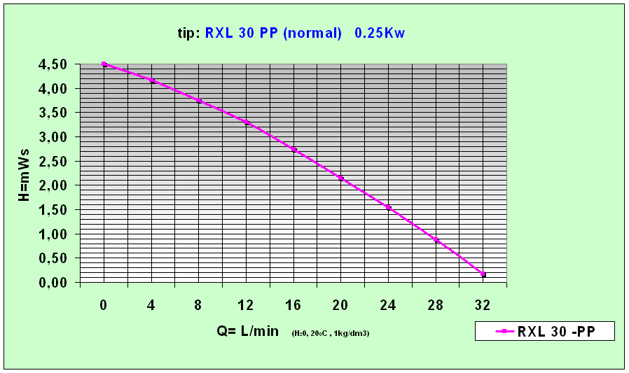 črpalke: | RXL 30 PP | | Moč motorja/: | 250 W 3X400V SIEMENS | | | Max pretok: | 30 l/min | | Max.tlačna višina: | 4.5 mVS | | Max. kinem.viskoznost | 114 mm/s2 | | | Material črpake /ohišje/gred/prevleka | polipropilen/st52/pp | | Max temp medija: | 80 C | | Dim sesalne cevi: | DA20mm | | MAX Dolžina sesalne cevi: | 1000 mm | | Dim tlačne cevi : | DA 16 mm | | Tesnenje | BREZLEŽAJNA IZVEDBA | | Teža: | 4 kg | | | samosesalna dolžina: | 200 mm | | izvedbe: | PP PVC ali inox 1.4571 | | Način priklopa tlač cevi | holandec,prirobnica ali smerekica | | | | | | | LAHKO OBRATUJE V SUHEM TEKU. |