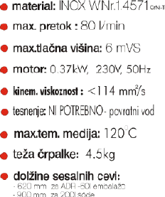 ( gre v ADR hobok ) | | pogon: | SIEMENS 380W , 230V 50Hz | | premer tlačnega cev.: | D 25 mm | | tesnenje : | oks.keramika / epdm / oks.keramika ,PTFE | | max pretok: | 80 l/min = 4,8m3/h |