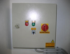 | KAKO NAPRAVA OBRATUJE: -vstavimo v odprino prah cca 12kg ,zapremo pokrov,vključimo glavno stikalo in vključimo stikalo start da začne dozirati : -imamo možnost AUTO/ROČNO avtomatko impulzivno doziranje s pavzami ali pa neprekinjeno doziranje -imamo možnost nastavitve hitrosti doziranaj s potenciometrom 10-100% po opravljenem delu izklučimo glavno stikalo. Opis krmilne omarice na čelni stani elektroomarice so montirani sledeči elementi. glavno stikalo indikator obratovanja -lučka